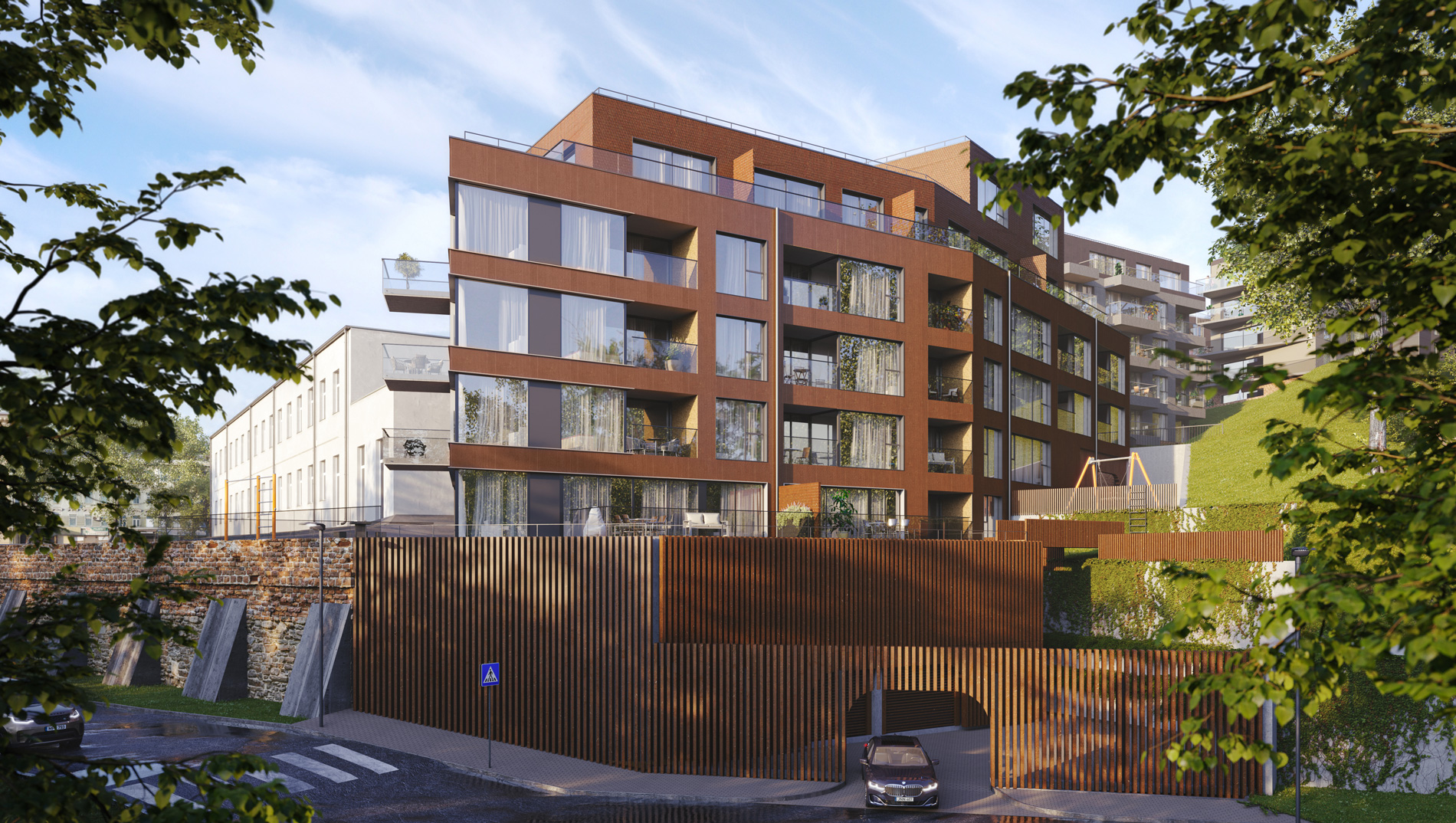Šalia namo įrengiama iškilioji pėsčiųjų perėja su apšvietimu, tvarkomos aplinkinės dangos. Daugiabutį, kaip ir visą kvartalą, supa išvystyta infrastruktūra – kavinės, parduotuvės, viešbučiai, masažo bei grožio salonai, sveikatos klinikos, Lukiškių aikštė, Tauro kalnas bei kiti lankytini sostinės objektai.