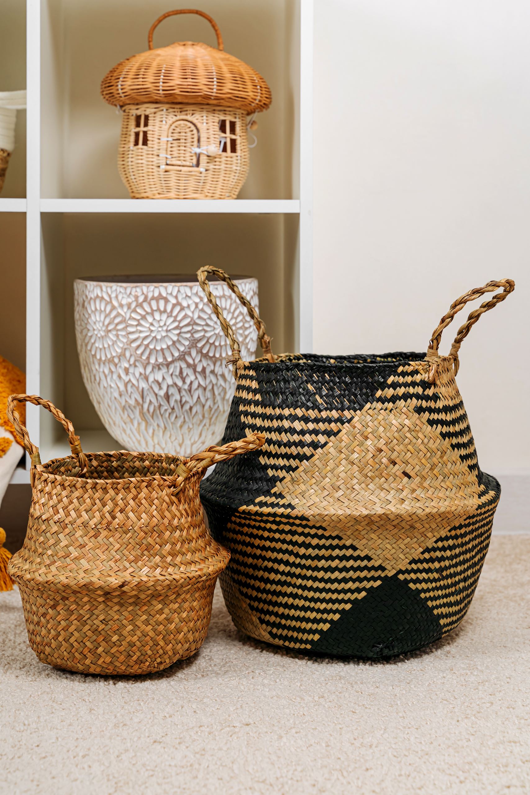 Jų laikymui galima panaudoti ir jau klasikinius sprendimus. Tai – stilingi pinti krepšiai ar prie namų interjero priderintos daiktadėžės. Sudėkite jas ant lentynų, į atviras komodos erdves, laikykite po stalu šalia kėdžių. Taip šiuos svetaines organizavimo pagalbinius prireikus pasieksite greitai, o, pripildę vaikų daiktų, išsaugosite interjero harmoniją bei estetiką.